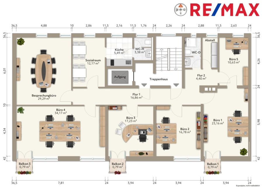 - 6 unterschiedliche Größen von Büros mit 13,4 m² bis zu 34,17 m²