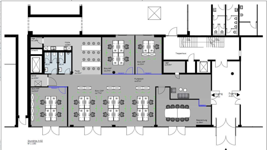 - großzügige Open-Space-Bereiche kombiniert mit separaten Büro- und Besprechungsräumen