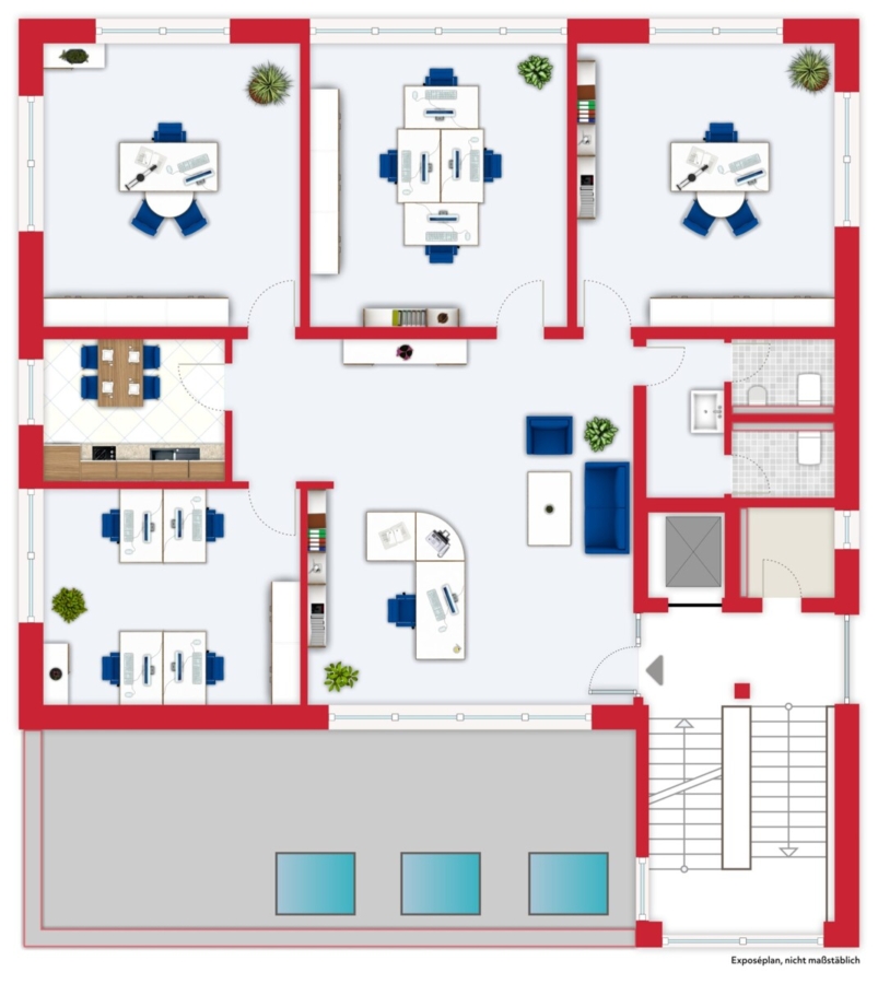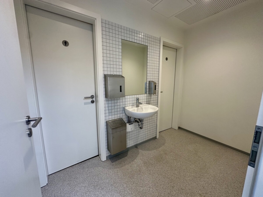 Die Fläche ist in insgesamt 4 Büros, einen großzügigen Eingangsbereich (perfekt geeignet als Empfangs- und Wartezone mit natürlicher Lichtzufuhr durch Dachluke und Fensterfront) sowie einen Personalraum/Küche unterteilt. Letzterer ist aktuell ohne Kücheneinrichtung.