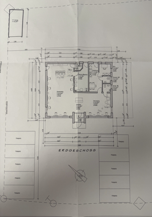 Dem Objekt sind insgesamt zwölf Stellplätze direkt auf dem Grundstück zugeordnet. Darüber hinaus steht eine Fertiggarage zur Verfügung, die den Nutzwert für Mitarbeitende oder betriebliche Zwecke ergänzt.