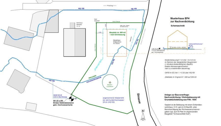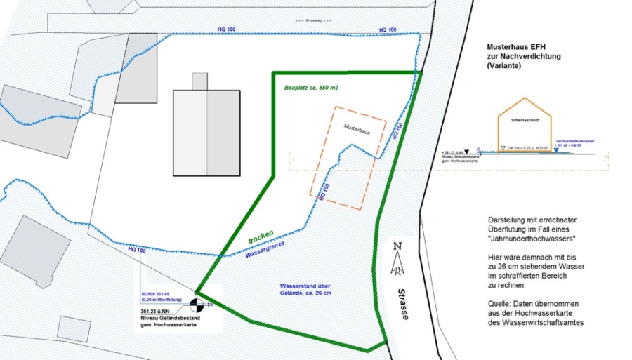 Beim angenommenen Jahrhunderthochwasserstand (HQ100), kann ein Teil des Grundstückes überflutet werden (siehe Lageplan im Bildteil: Südosten, bis ca. 26 cm Wassertiefe). Dementsprechend gelten hier die Bebauungsrichtlinien für Wohngebäude im hochwassergefährdeten Bereich, konkret: Der Erdgeschossfußboden muss über dem maximal errechneten Hochwasserstand liegen.