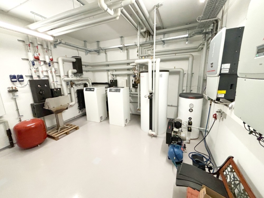 Es ist mit der neuesten Heiztechnik ausgestattet, zwei leistungsstarke Grundwasser-Wärmepumpen mit 21,5 kw Heizleistung speisen die Fußbodenheizung im gesamten Gebäude.