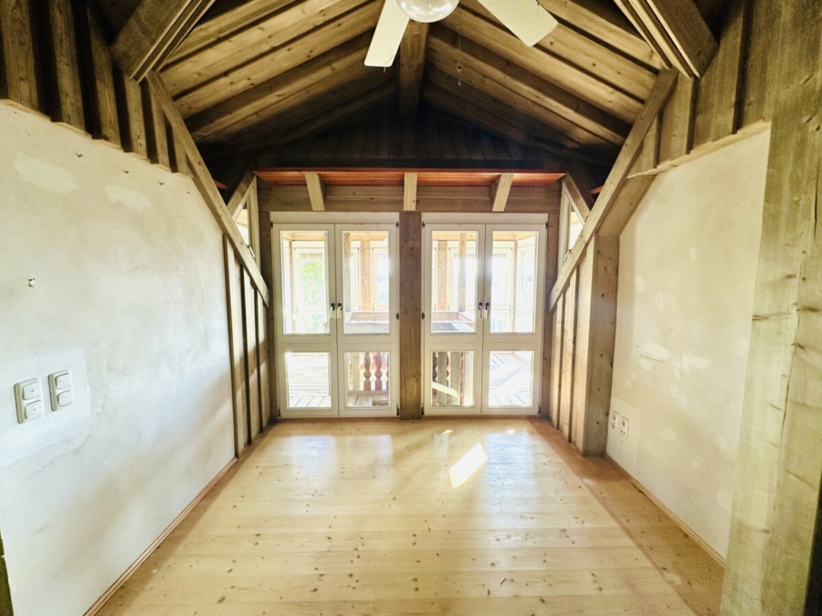 Das Dachgeschoss setzt die vielseitige Nutzung fort. Ein zentraler Flur verbindet die Räume und schafft eine großzügige Atmosphäre. Hier finden sich drei Schlafzimmer in unterschiedlicher Größe – vom kompakten Kinderzimmer bis hin zum großen Schlafzimmer, das zudem Zugang zu einem Balkon bietet, von dem sich der Blick über das Grundstück und das Donautal eröffnet.
