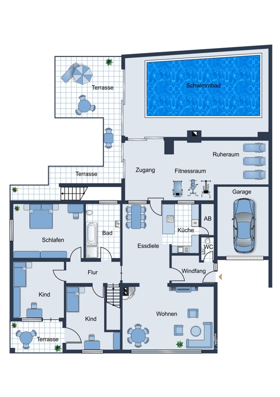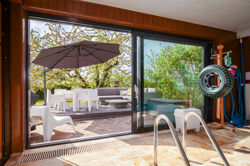 Im Anbau befindet sich ein zur Zeit genutzter Fitnessraum, von dort aus gelangt man in das innenliegende Schwimmbad.Im Untergeschoß befinden sich Kellerräume, 2 weitere Zimmer sowie ein Badezimmer.