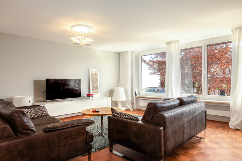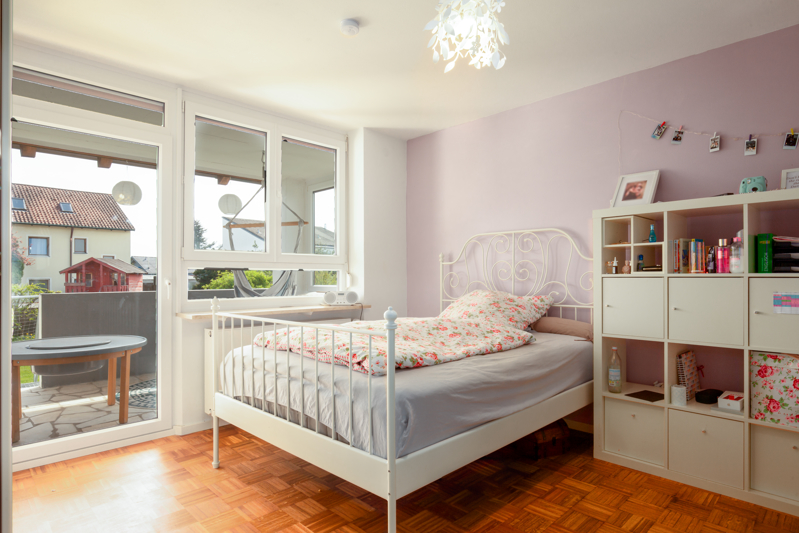 Im Erdgeschoß befindet sich eine 4 Zimmer Wohnung mit einer großen Südterrasse. Diese ist über die beiden Kinderzimmer erreichbar.