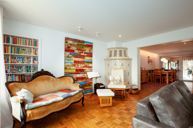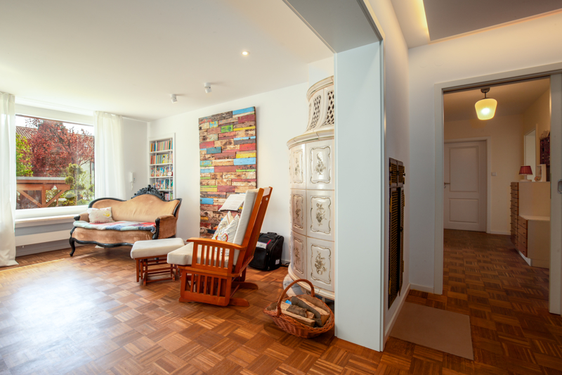 Im geräumigen Wohnzimmer befindet sich ein energiersparender und sehr schöner Kachelofen.