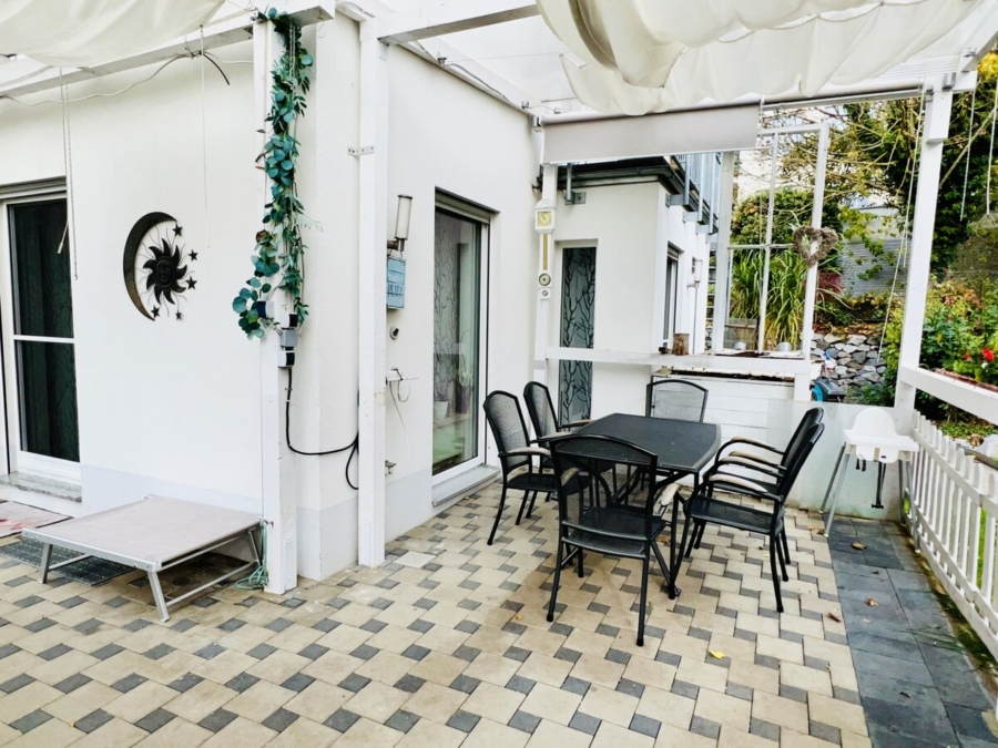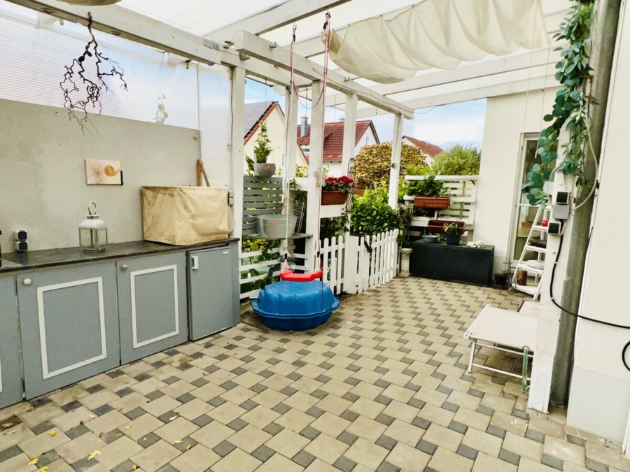 Die überdachte und gepflasterte Terrasse bietet einen idealen Platz für gemütliche Stunden im Freien.