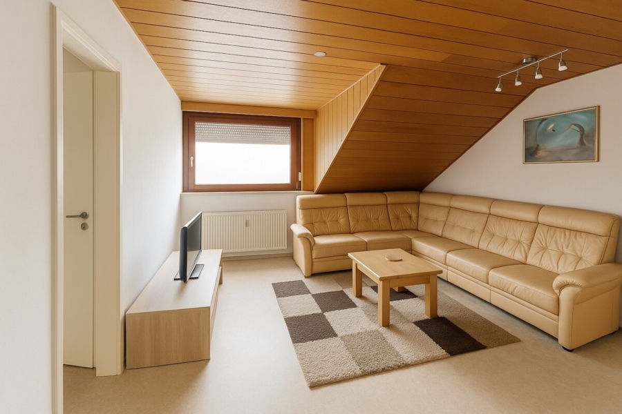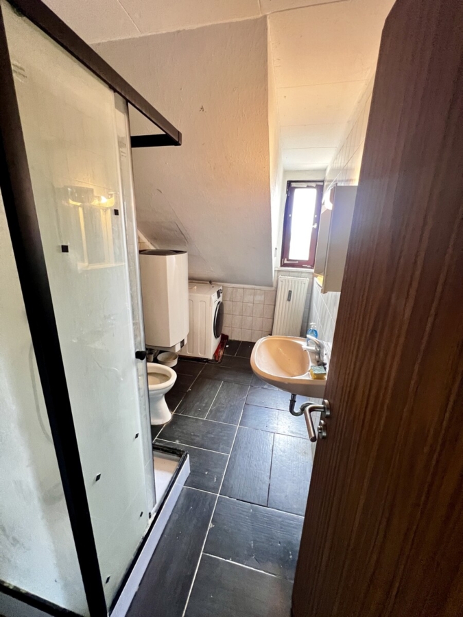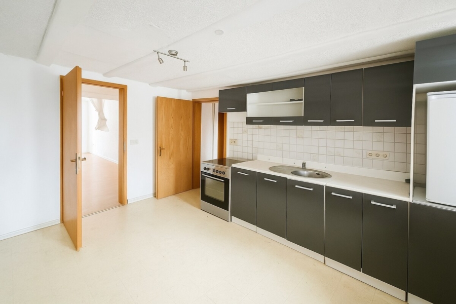 Im Obergeschoss öffnet sich eine klassische 4-Zimmer-Wohnung mit Küche und Bad – viel Platz für eine kleine Familie oder Mieter mit Wunsch nach Wohnkomfort.