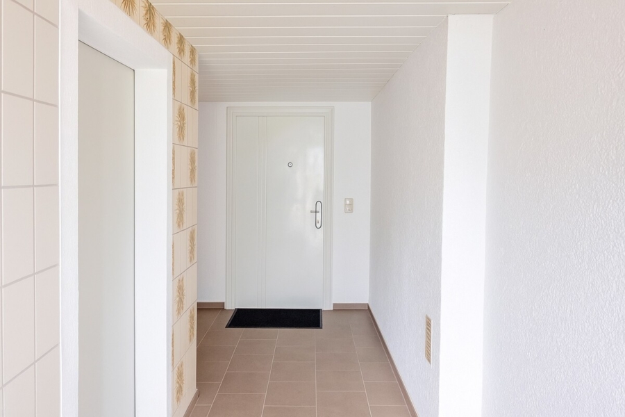 Schon im Erdgeschoss zeigt sich der funktionale Grundriss: Vom Flur aus gelangt man linker Hand in den Heizungsraum, geradeaus betritt man die erste Wohnung – eine 1-Zimmer-Einheit mit eigenem Bad, Küche, Diele und einem offenen Wohn-/Schlafbereich. Praktisch für Singles, Gäste oder als separates Büro.