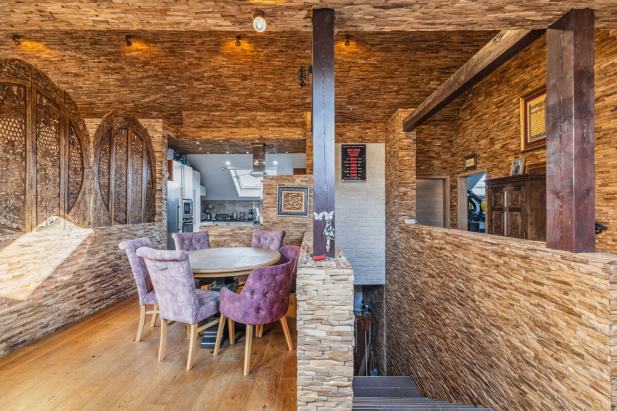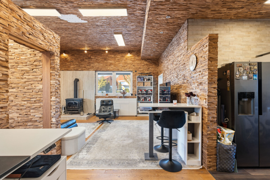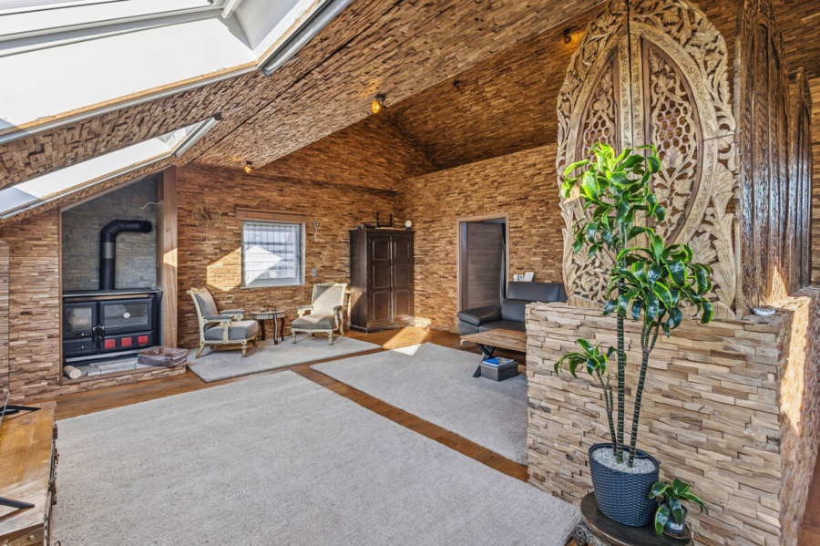 Die obere Wohneinheit präsentiert sich offen und lichtdurchflutet. Der weitläufige Wohn-, Ess- und Kochbereich mit hohen Decken, sichtbaren Holzelementen und teilweise künstlerisch gearbeiteten Raumteilern schafft eine außergewöhnliche Wohnatmosphäre. Drei Schlafzimmer, ein modernes Badezimmer sowie individuelle Designdetails runden diese Etage ab.