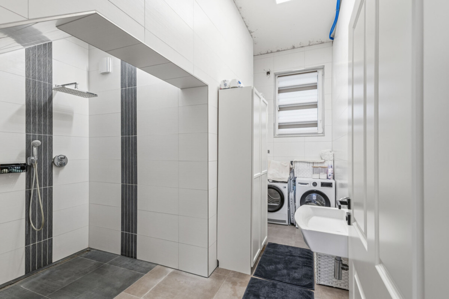 Die untere Wohneinheit verfügt über einen separaten Zugang und bietet ein modernes Bad mit ebenerdiger Dusche, ein Schlafzimmer sowie einen offenen Wohn-, Ess- und Kochbereich, der großzügig gestaltet ist und viel Licht hereinlässt.