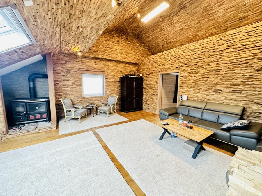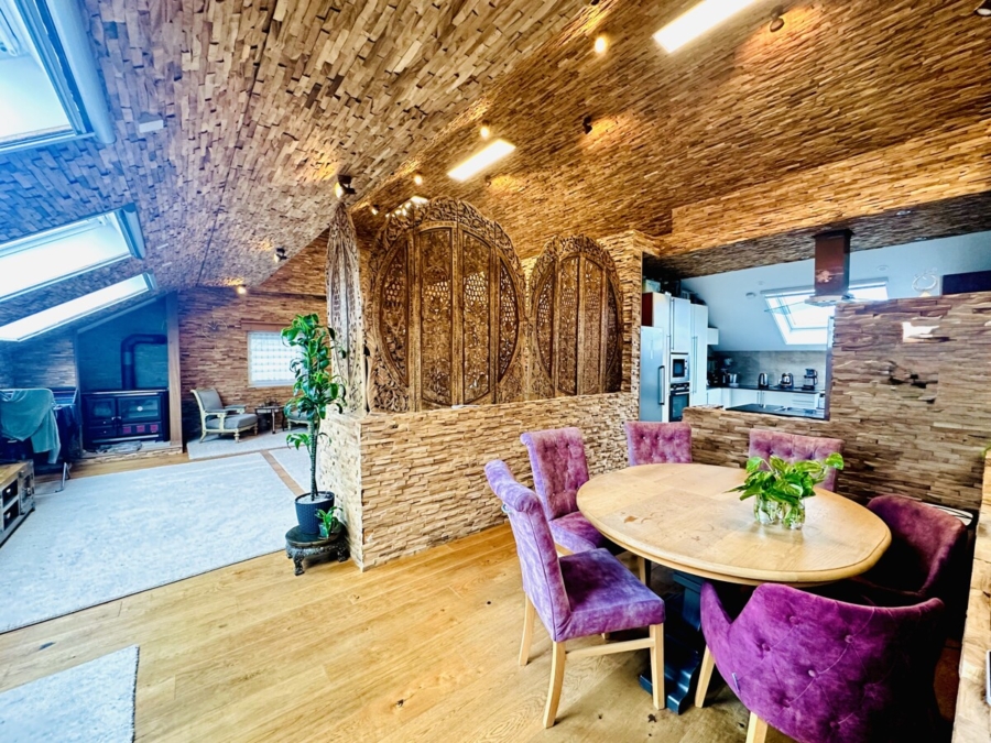 Die obere Wohneinheit präsentiert sich offen und lichtdurchflutet. Der weitläufige Wohn-, Ess- und Kochbereich mit hohen Decken, sichtbaren Holzelementen und teilweise künstlerisch gearbeiteten Raumteilern schafft eine außergewöhnliche Wohnatmosphäre. Drei Schlafzimmer, ein modernes Badezimmer sowie individuelle Designdetails runden diese Etage ab.
