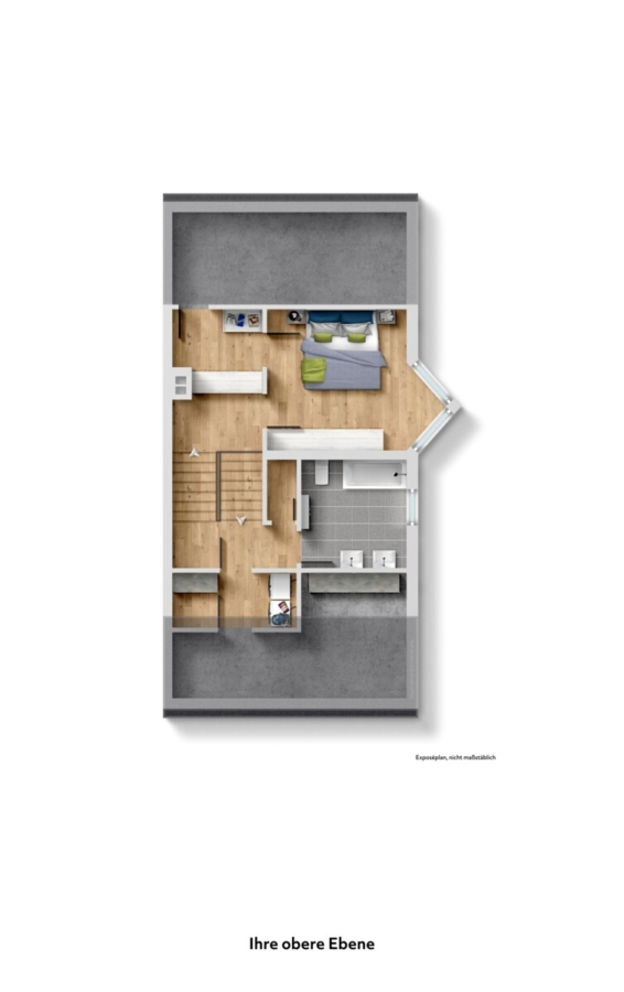 Die Ebenen unter dem Dach mit leichter Mansarde schließlich beherbergen zum einen Ihr Elternbadezimmer mit nebenliegendem Hauswirtschaftsraum sowie zum anderen Ihr Elternschlafzimmer nebst angrenzender Ankleide.