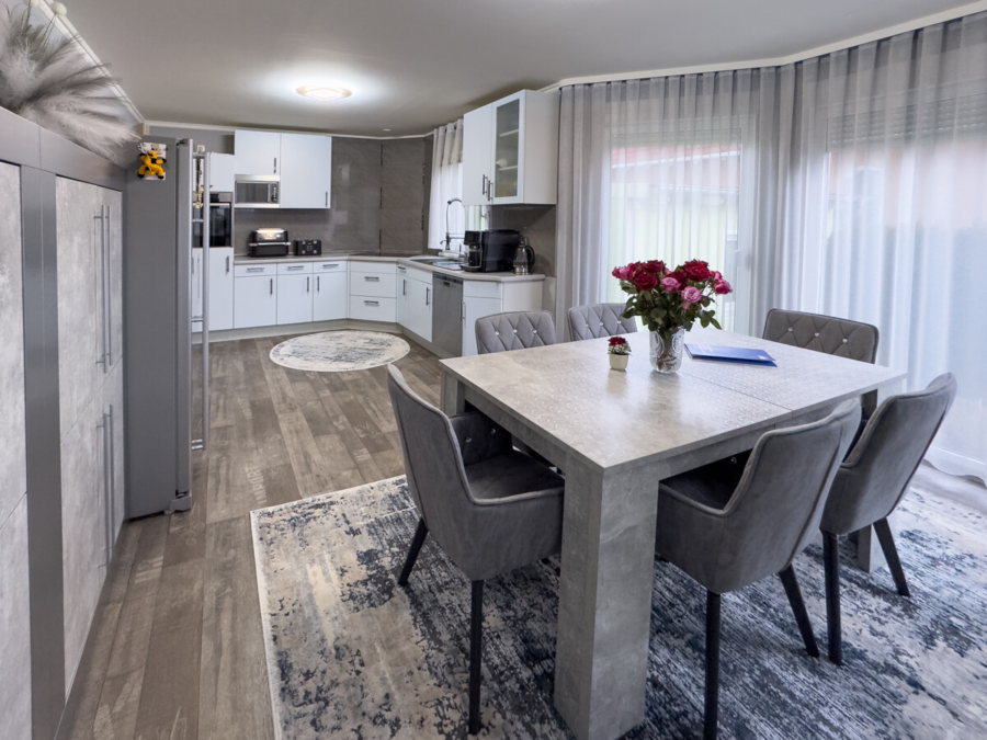 Über den kleinen Windfangie betreten Sie die Garderobe mit Zugang zum erst 2025 modernisierten Gästebad. Die anschließende zentrale Treppendiele verbindet die Geschosse und erschließt im Erdgeschoss die sehr großzügige Wohnküche und das Wohnzimmer mit einem vorgelagerten überdachtem Freisitz.