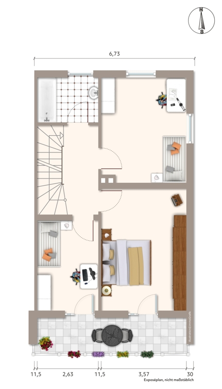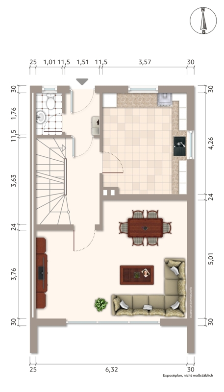 Das Erdgeschoss, auf dem das alltägliche Leben statt findet, bietet ca. 54 m² Wohnfläche.