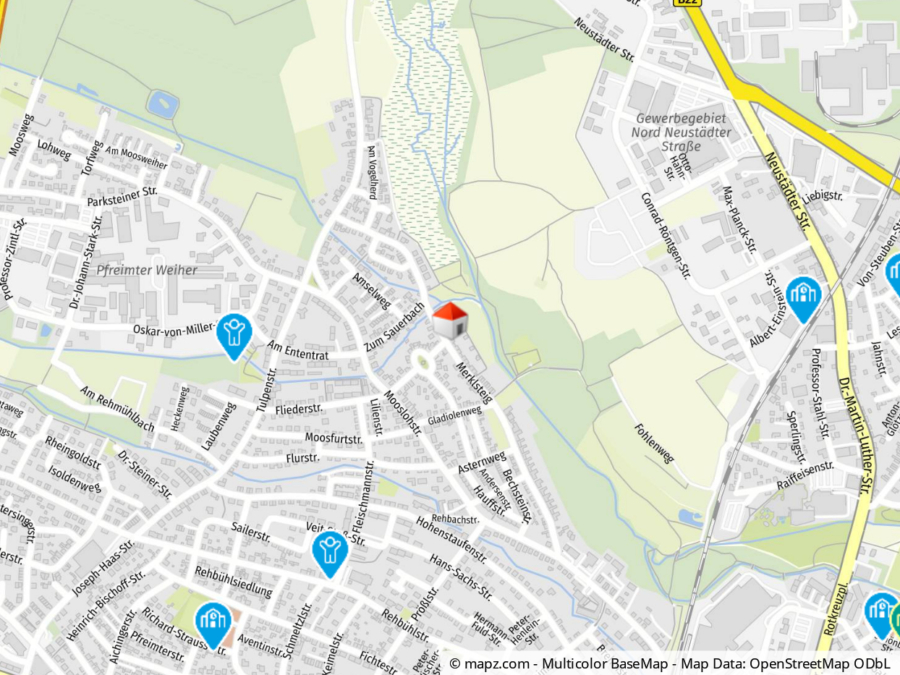 Das Anwesen liegt absolut ruhig im Stadtgebiet von Weiden in der Oberpfalz, im Bereich der Mooslohe. Viel Grün rund um das Haus landen zu Spaziergängen ein.