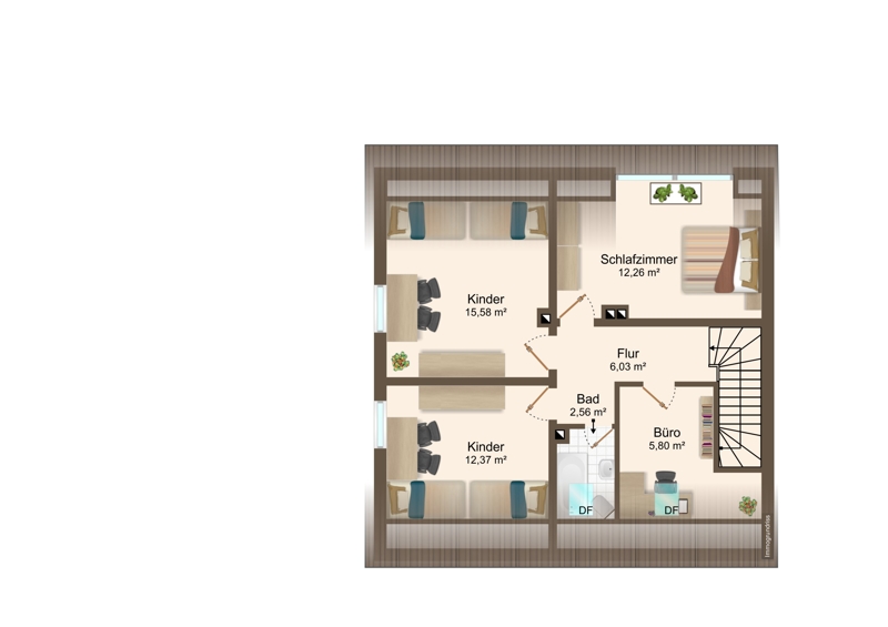 Im Dachgeschoss wartet nicht nur ein weiteres Bad samt Badewanne auf Sie, sondern auch vier weitere (Schlaf-) Zimmer.