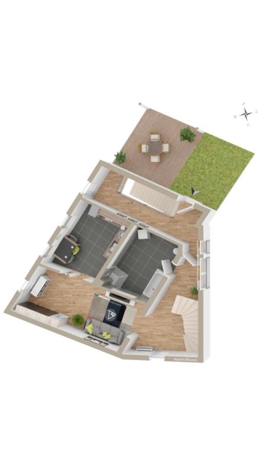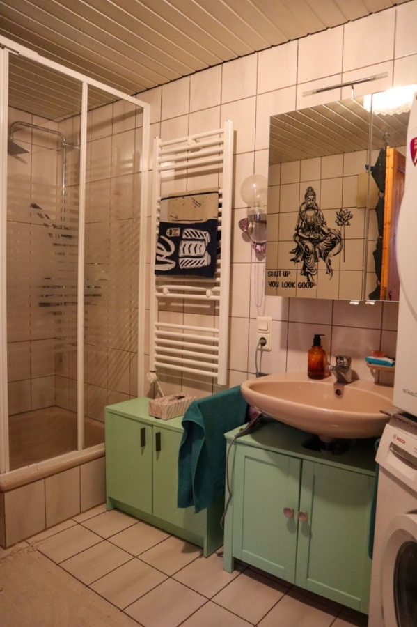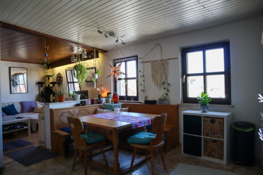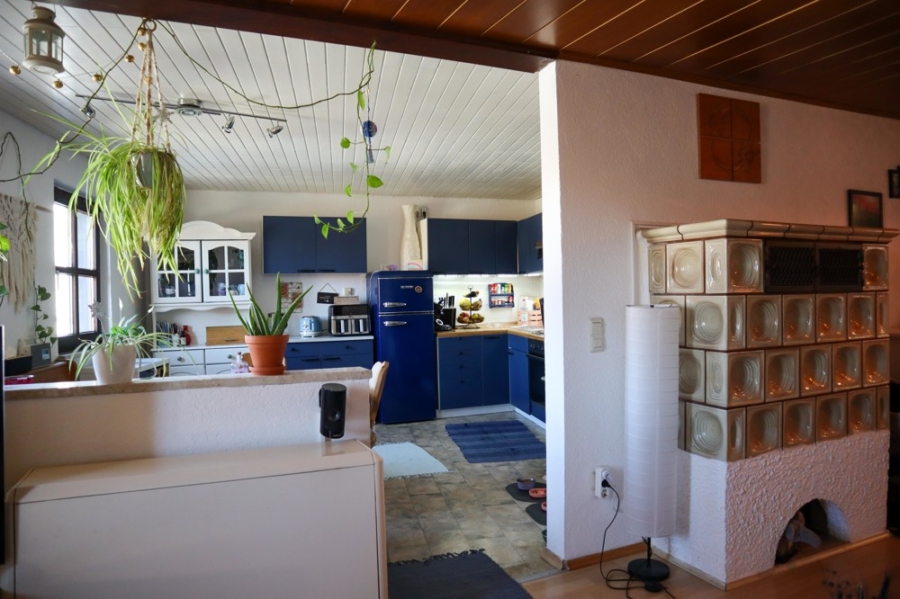 Auf der zweiten und dritten Etage befindet sich eine weitere Wohnung mit ca. 146,35 m² Wohnfläche. Auf der unteren Ebene dieser Einheit finden Sie den stattlichen Wohn-/Ess-/ und Kochbereich vor, ausgestattet mit einem Kachelofen. Zudem einen großzügigen Flur und ein innenliegendes Badezimmer mit Wanne und Dusche. Hier haben Sie auch den Anschluss für Waschmaschine und Trockner. Von dieser Etage aus haben Sie Zugang zu dem nach Südwesten ausgerichteten Garten mit Freisitz und Ausblick über Bad Abbach und der Donau.