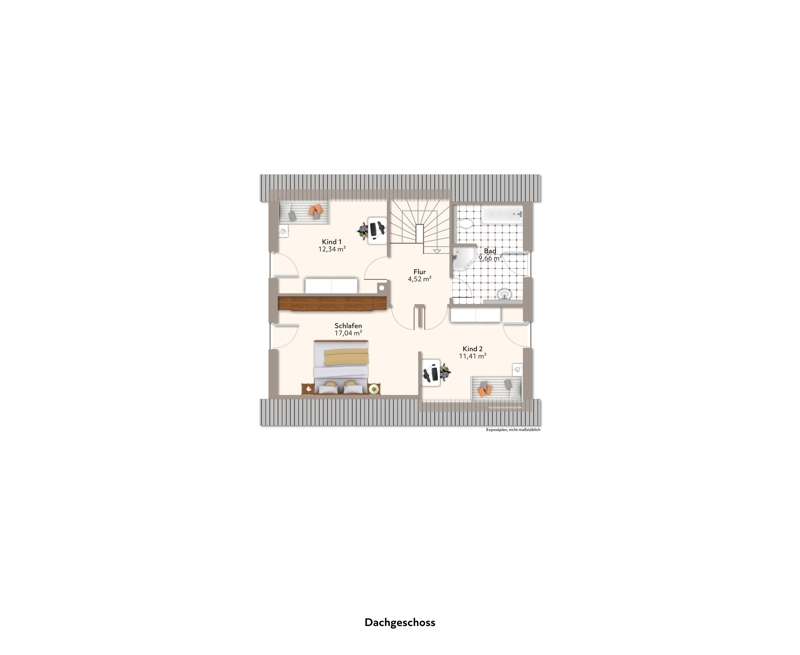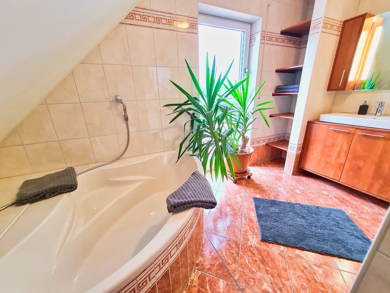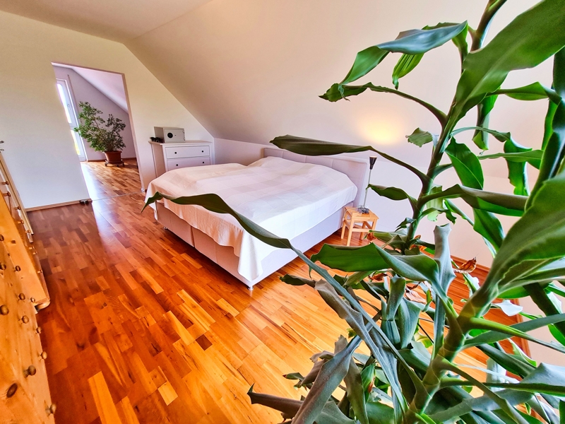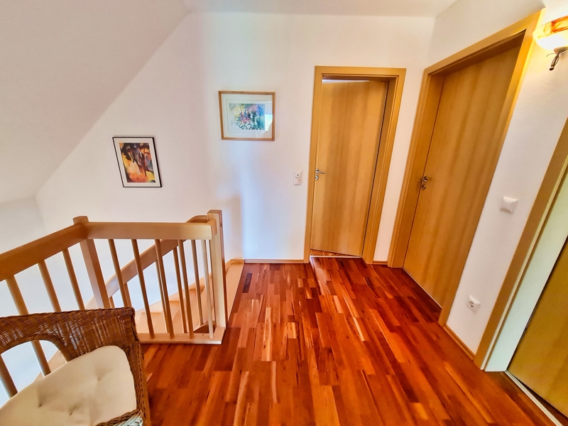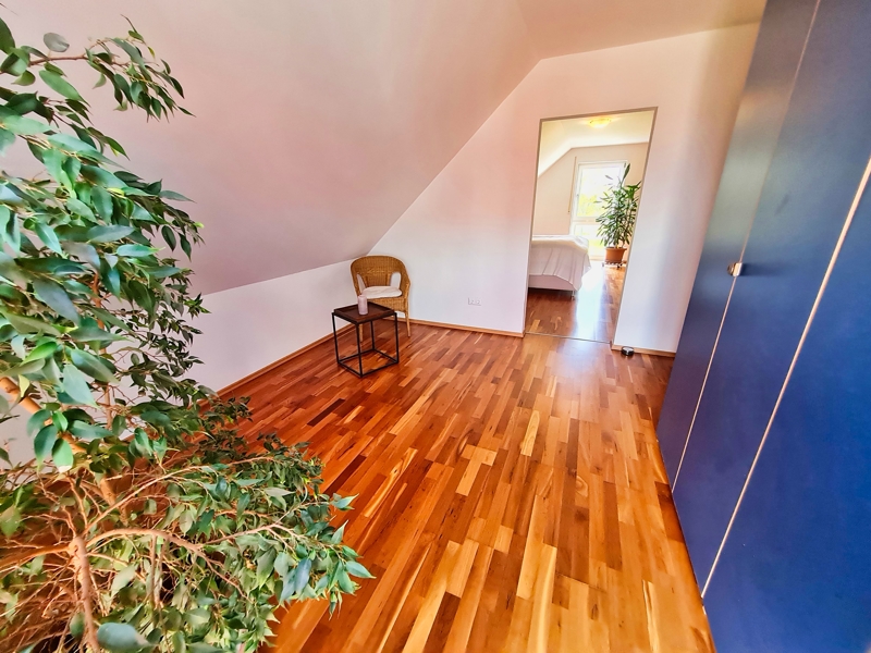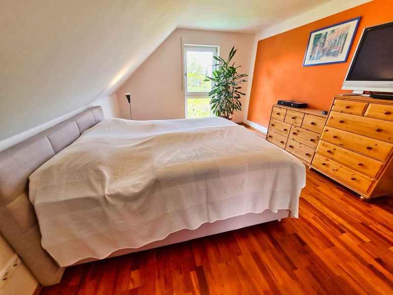 Treppauf bietet Ihnen Ihr Dachgeschoss drei weitere (Schlaf) – Räume sowie ein großes Badezimmer mit Wanne, Dusche und Fenster.