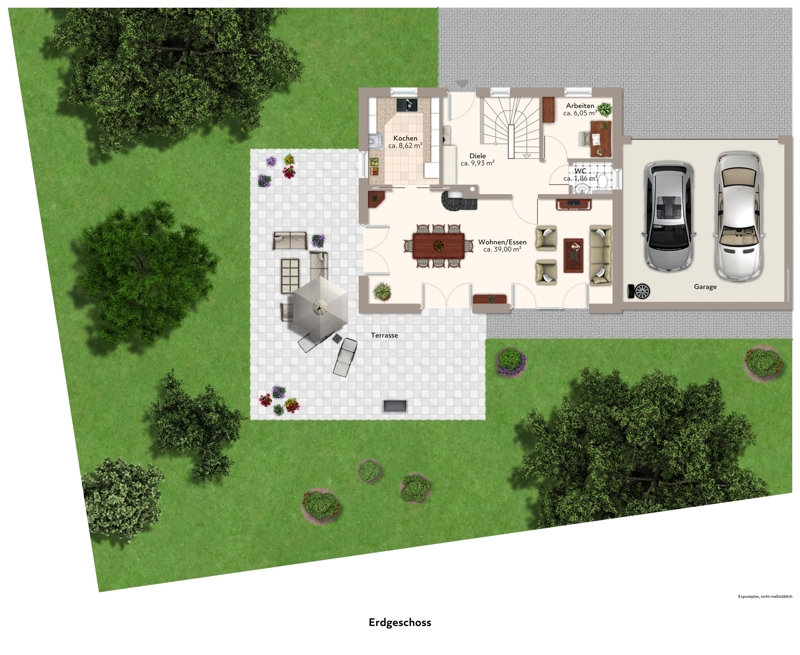 Ihre Fahrzeuge parken Sie in Ihrer Doppelgarage neben dem Haus.