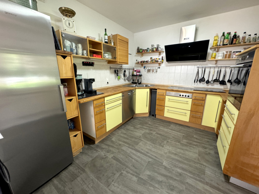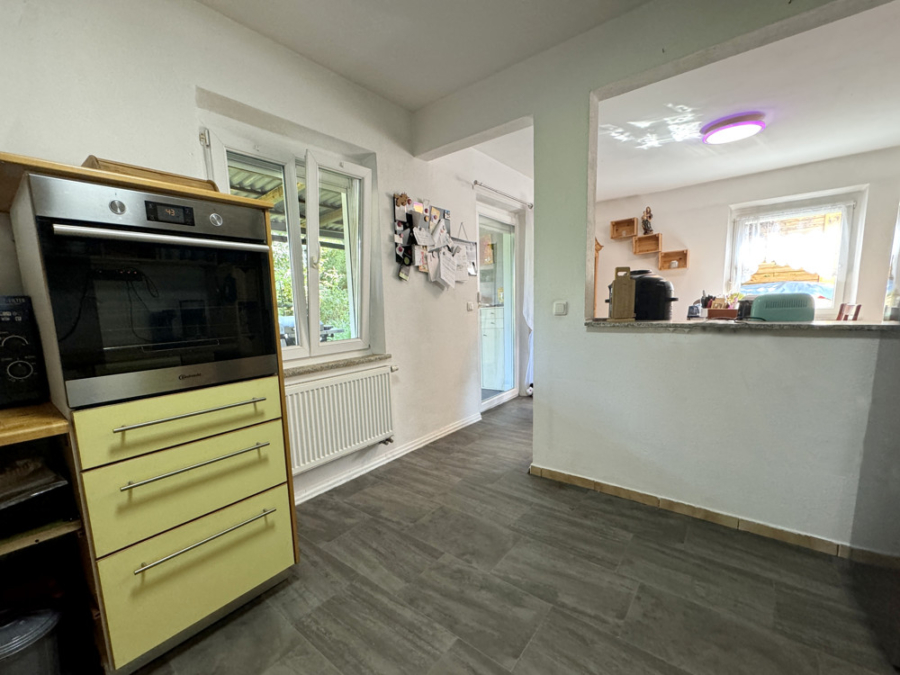 Die Küche ist mit Geräten ausgestattet und bietet eine praktische Durchreiche zum Esszimmer.