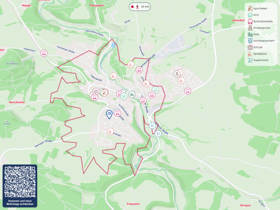 Im historischen Ortskern von Beratzhausen befinden sich alle Einkaufsmöglichkeiten sowie 3 Kindergärten, Grund- und Hauptschule. Weiterführende Schulen sind mit der Bahn bestens erreichbar.