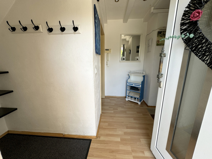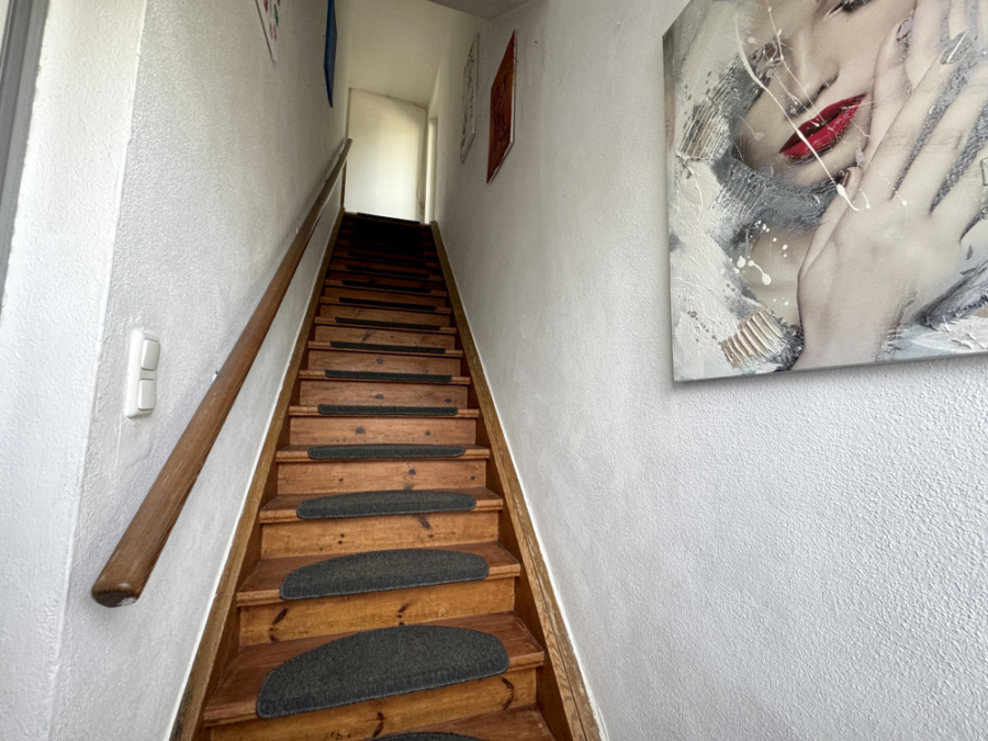 In das Obergeschoss gelangen Sie über die nicht sichtbare Holztreppe im Wohnzimmer.
