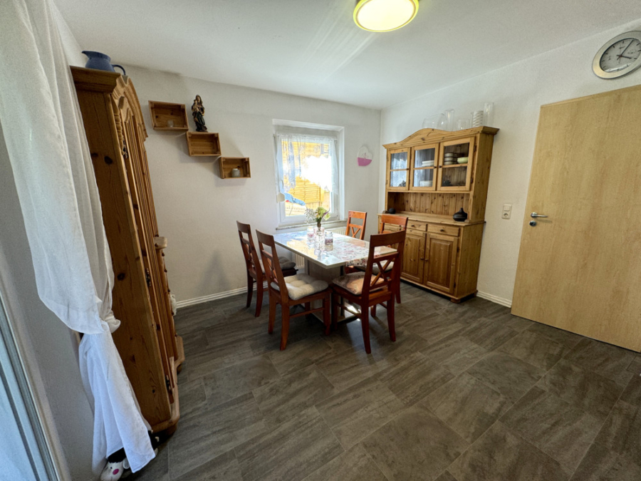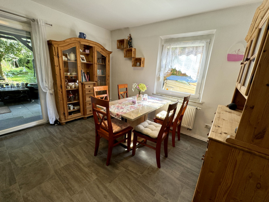 Von hieraus gelangen Sie über die Terrassentür zur großen überdachten Terrasse und dem liebevoll gestalteten Garten.