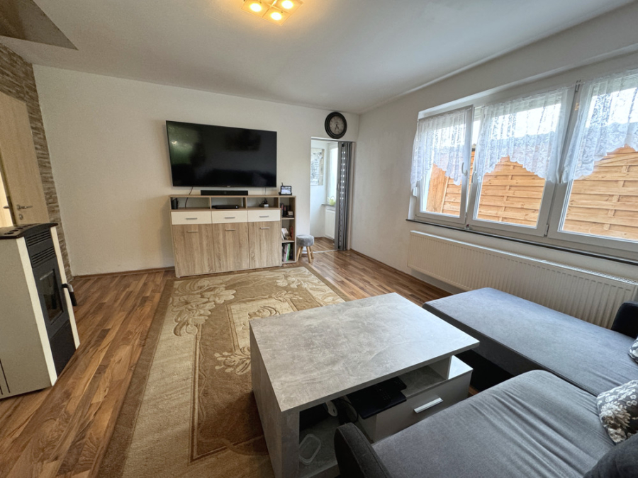 Das durch die große Fensterfront Licht durchflutete Wohnzimmer bietet viel Platz. Der programmierbare Pelletofen sorgt in den kalten Monaten für ein wohlig warmes Ambiente.