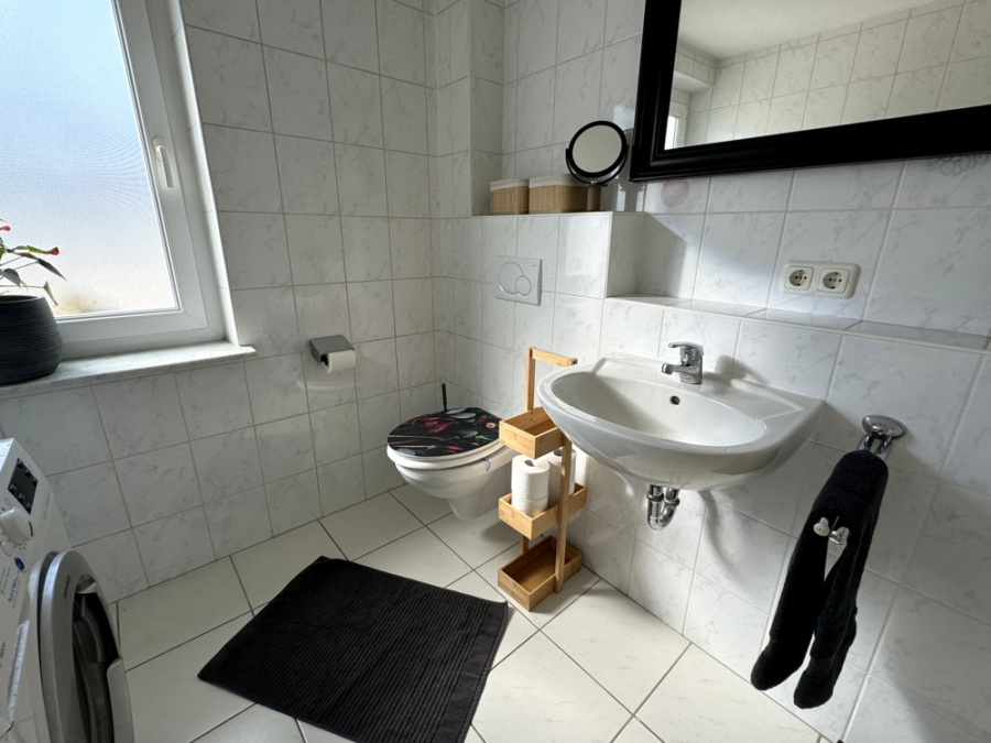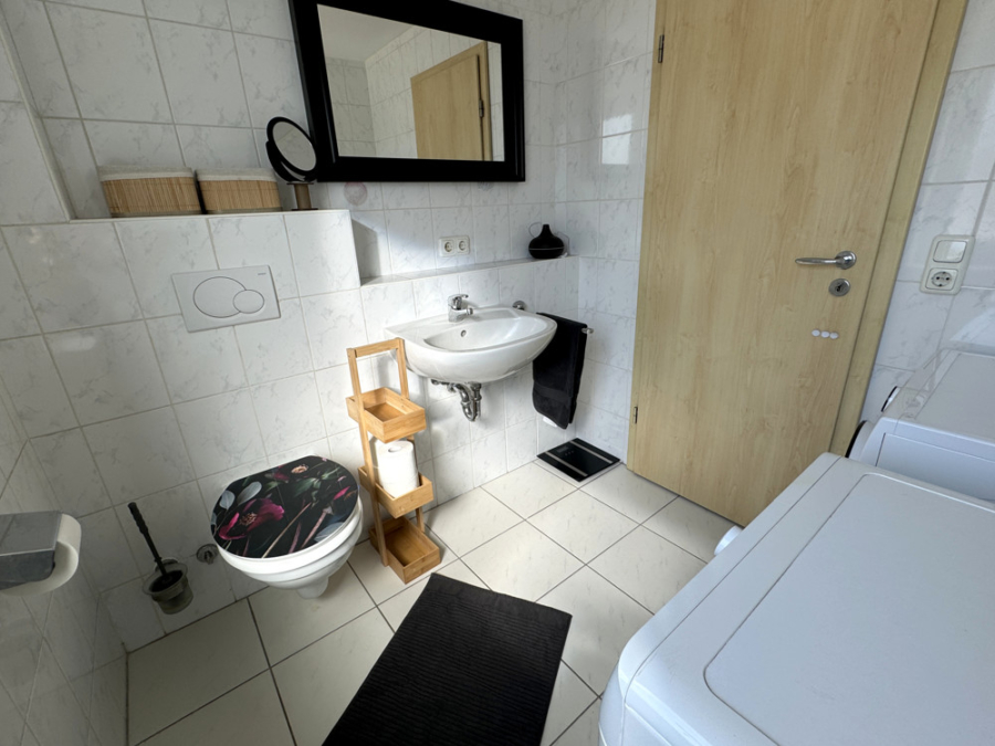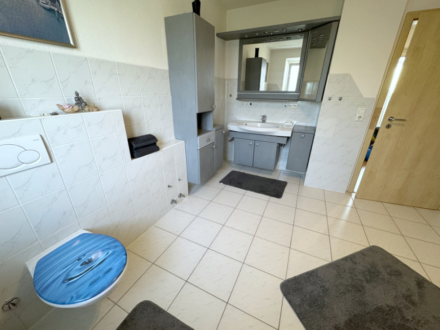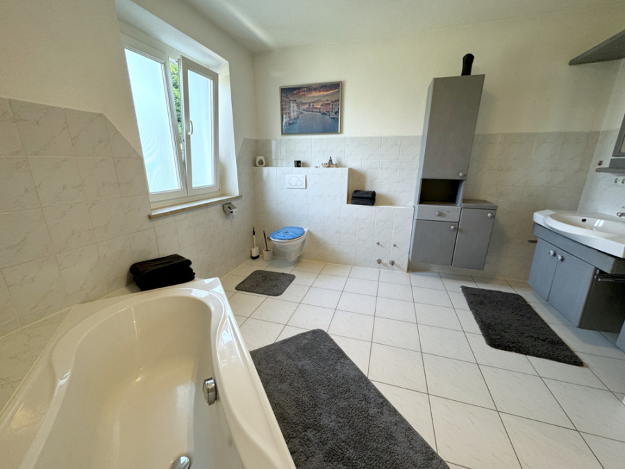 Das geräumige Hauptbadezimmer im Obergeschoss ist mit einer Badewanne und Toilette ausgestattet. Ein weiteres kleines Badezimmer mit Dusche und WC und ergänzt so das Raumangebot.