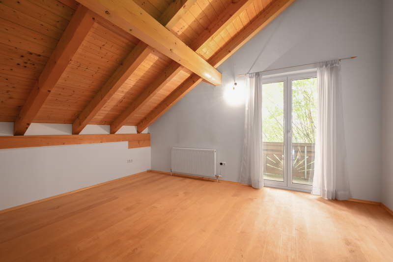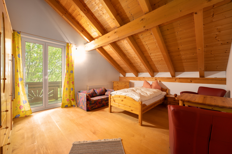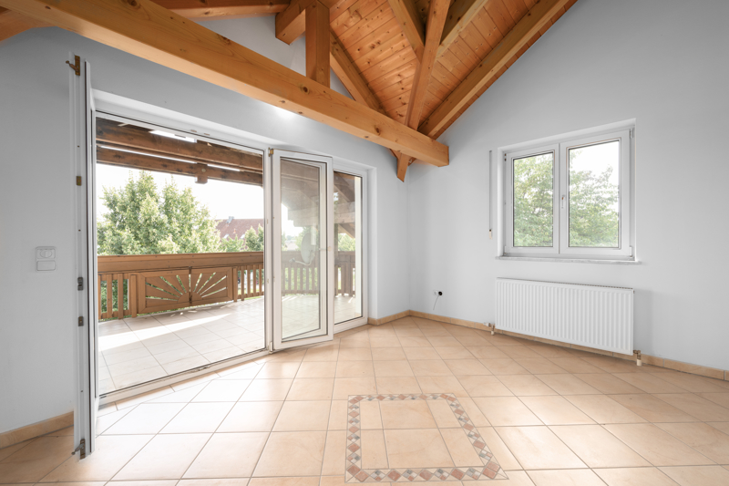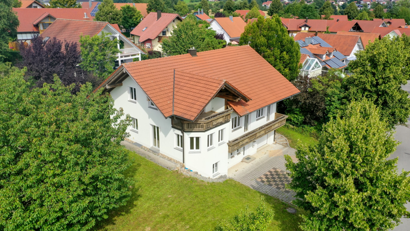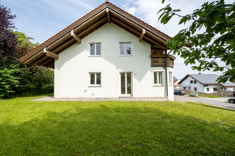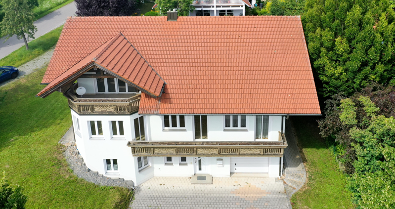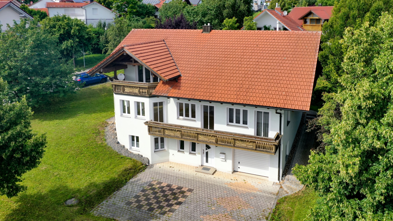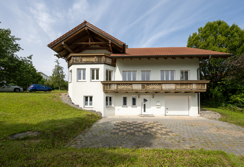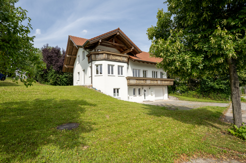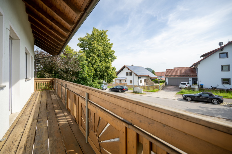 Ein unglaublicher Ausblick eröffnet sich vom überdachten Balkon im DG. Von hier aus sehen Sie nicht nur den Bogenberg, an klaren Tagen können Sie bis in die Alpen schauen.