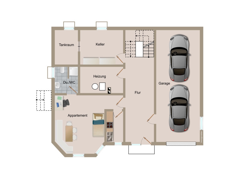 Für Ihre Fahrzeuge steht Ihnen eine große Garage zur Verfügung, mit direkter Anbindung an den Flur im Keller.