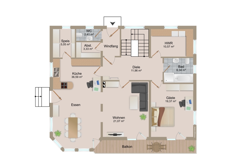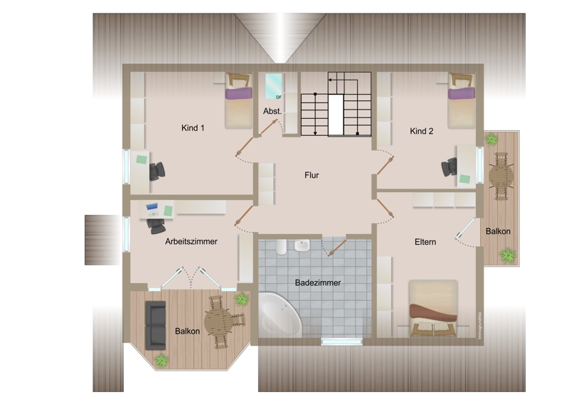 Die Raumaufteilung bietet Ihnen alle Möglichkeiten. Hier gibt es genügend Platz für eine große Familie (oder auch als Mehrgenerationenhaus) – Wohnen und Home Office ist hier ebenfalls problemlos möglich.