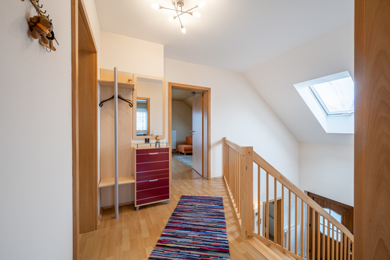 Das Obergeschoss führt die Linie des Hauses fort. Links und rechts zum Giebel sind zwei große Räume angeordnet, in der Mitte ein weiteres Badezimmer. Das Obergeschoss kann wie eine Art Einliegerwohnung genutzt werden. Im westlichen Bereich ist sogar schon eine Küchenzeile installiert und der Raum ist ausreichend groß um als Wohn-/Esszimmer genutzt zu werden. Außerdem bietet der Westbalkon einen sonnigen Platz zum Entspannen. Das zweite Zimmer geht ebenfalls fast über die gesamte Hausbreite, praktisch sind hier jeweils die Speicherflächen in den Dachschrägen.