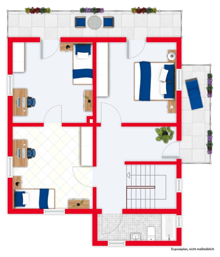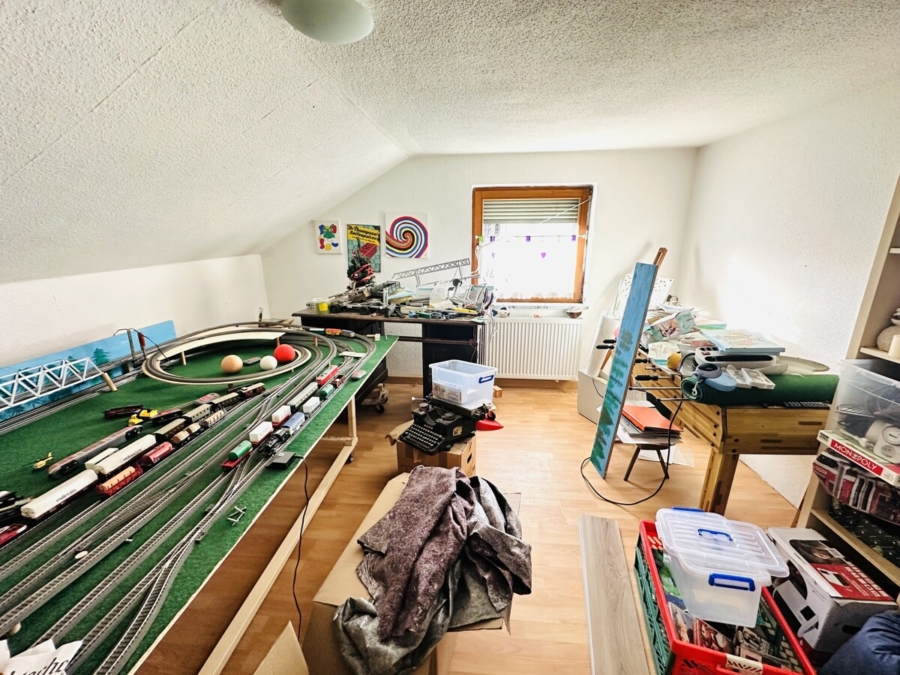 Im Obergeschoss stehen weitere Räume zur Verfügung, die sich flexibel als Schlafräume, Büro oder Hobbybereiche nutzen lassen. Diese Zimmer sowie der Treppenhaus und Gangbereich im oberen Stockwerk bieten Renovierungspotenzial und können nach eigenen Vorstellungen gestaltet werden. Das Badezimmer im Obergeschoss wurde im Jahr 2025 erneuert und ergänzt die bereits modernisierten Sanitärbereiche des Hauses. Der Balkon im oberen Geschoss bietet einen angenehmen Ausblick in die umliegende Waldlandschaft.