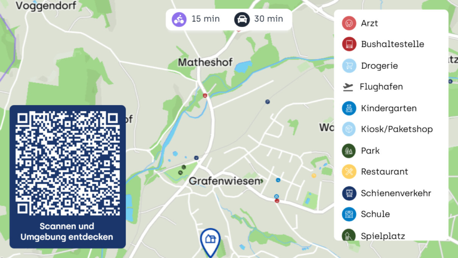 Das Haus liegt in Grafenwiesen in einer ruhigen und naturnahen Wohngegend. Die Umgebung ist geprägt von Wiesen, Feldern und Waldgebieten, wodurch eine angenehme und entspannte Atmosphäre entsteht. Die Ausblicke aus dem Haus unterstreichen den ländlichen Charme und vermitteln ein Gefühl von Weite und Ruhe.