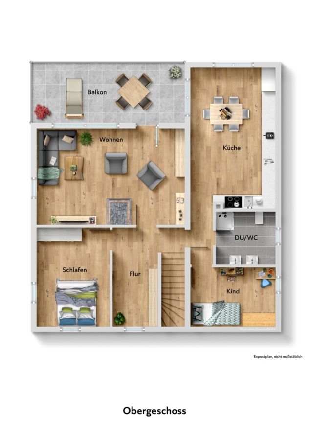 Und rechter Hand wiederum erschließen sich Ihnen ein Kinderzimmer, ein Badezimmer sowie eine Küche.