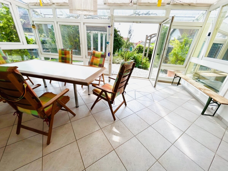 Geradewegs gelangen Sie in eine Küche mit einem angrenzenden Wohnzimmer - Sie sowohl als auch über einen Wintergarten auf die Terrasse führend.