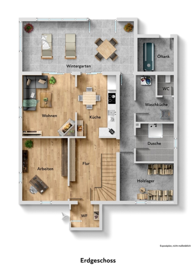 So sehen Sie bodenseits überwiegend Fliesen, Parkett und Laminat. Begegnen Ihnen helle Holztüren. Und sitzen Sie in dem aus weißen Kunststoff Fenstern wie Türen bestehenden Wintergarten.