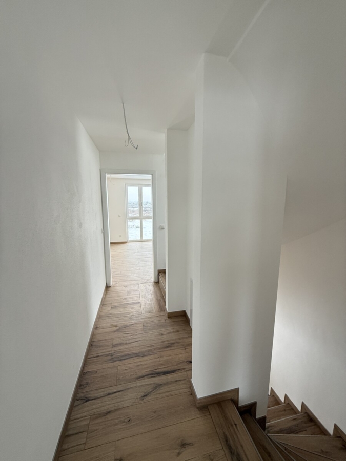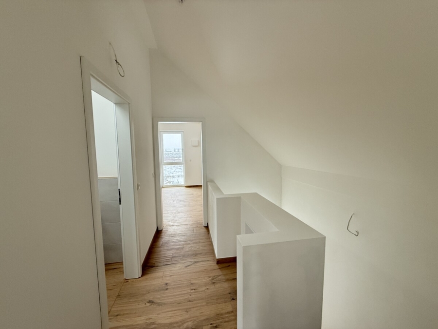 Im Obergeschoss befinden sich ein ruhiges, großzügiges Schlafzimmer mit begehbarer Ankleide sowie ein komfortables Badezimmer mit Badewanne und Luxusdusche, das ausreichend Platz für eine moderne Ausstattung bietet. Diese Etage dient als privater Rückzugsbereich für die Eltern.
