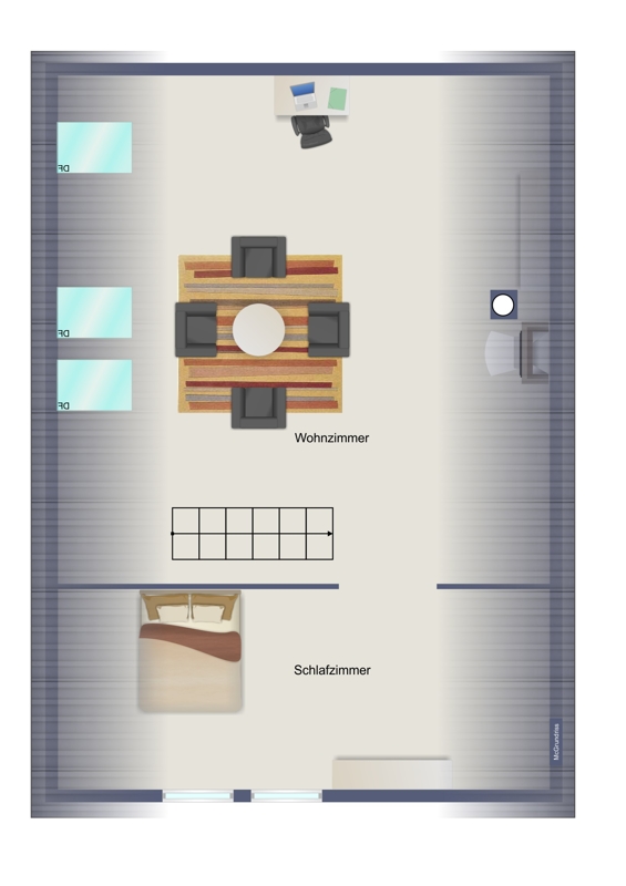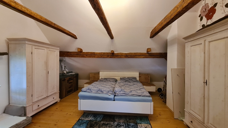 - ist die momentane Raumaufteilung mit 3 Zimmern. Das Wohnzimmer im DG hat ca. 60 m² und könnte unterteilt werden. Ebenso wäre vielleicht eine Erweiterung der angrenzenden Scheune denkbar (ohne Gewähr).