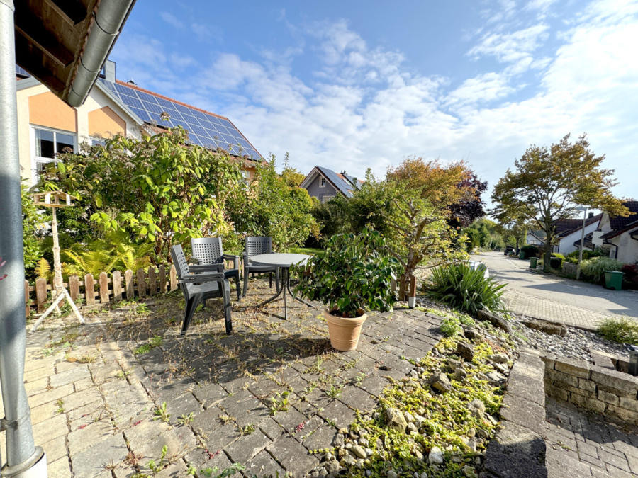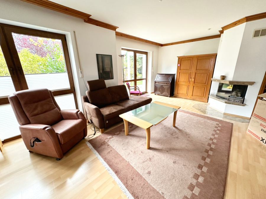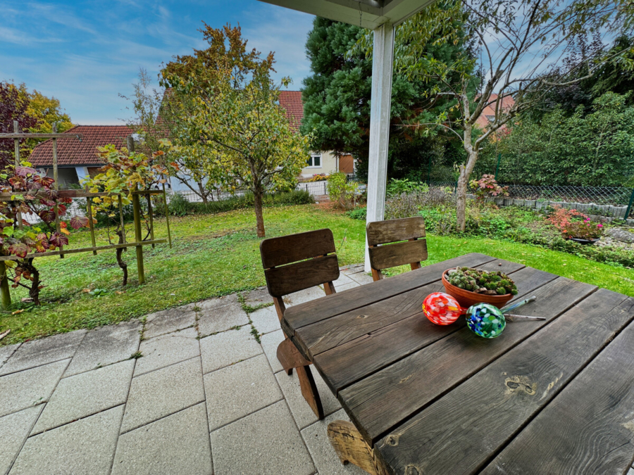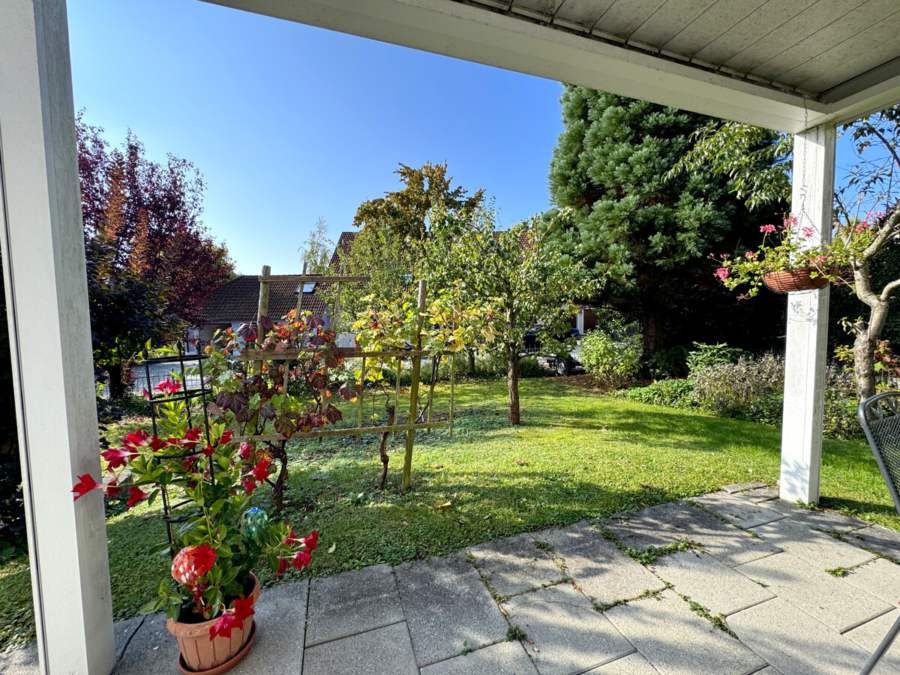 Vom Wohnzimmer und einem Arbeitszimmer gelangen Sie auf Ihre überdachte Süd Terrasse und in Ihren wunderschönen Garten.