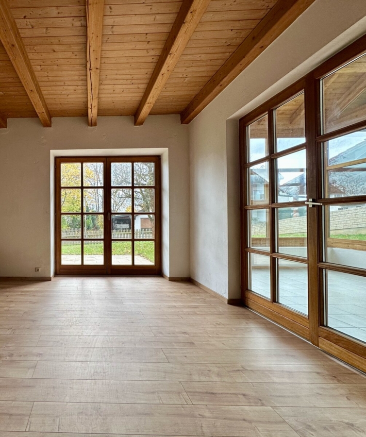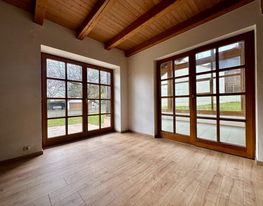 Das Wohnzimmer besticht durch seine helle Atmosphäre und bietet direkten Zugang zum beheizten Wintergarten mit Rundumverglasung. Von hier aus genießen Sie den Blick in den gepflegten Garten und gelangen weiter auf die vordere Südterrasse, die sich ideal zum Entspannen eignet.
