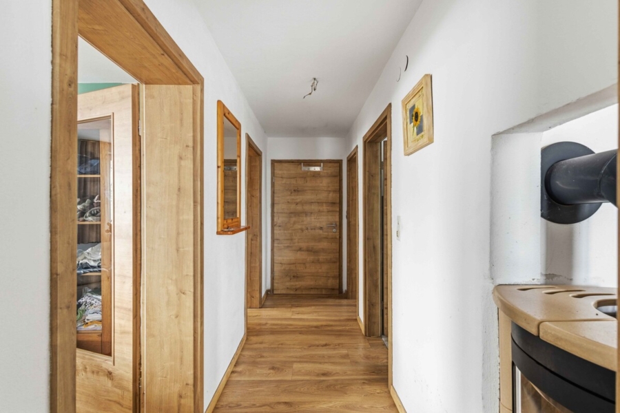 Sie betreten das Haus über das Erdgeschoss und gelangen in den zentralen Flur, der die Räume praktisch erschließt.