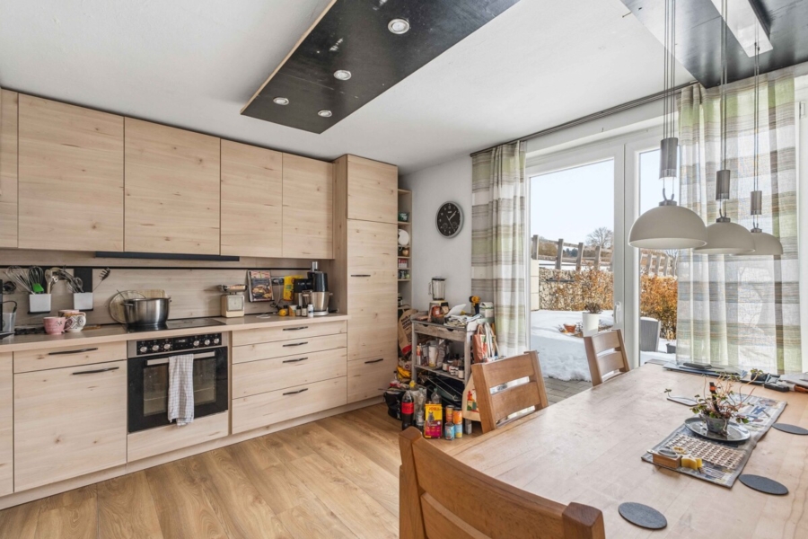 Angrenzend befindet sich die Küche im Erdgeschoss, ausgestattet mit einer Einbauküche und Essbereich.