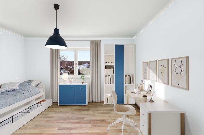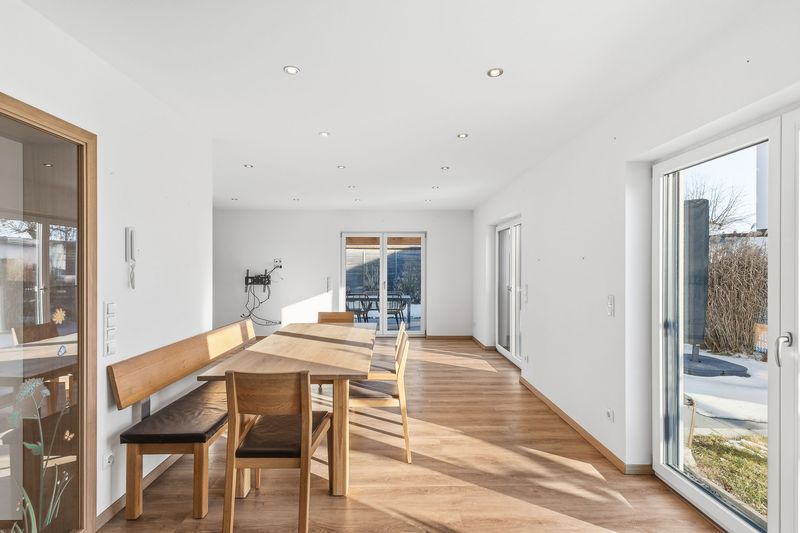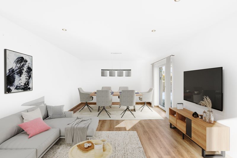 Der großzügige Wohn- und Essbereich bildet das Herzstück des Hauses. Große Fensterflächen sorgen für viel Tageslicht und ein angenehmes Wohnambiente. Die offene Gestaltung schafft eine perfekte Verbindung zwischen Kochen, Essen und Wohnen – ideal für das Familienleben und gesellige Abende.