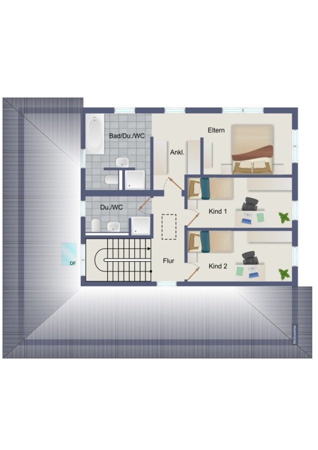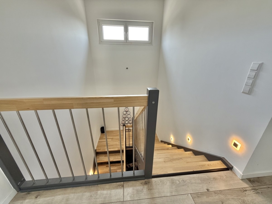 Eine moderne Treppe verbindet das Erdgeschoss mit dem privaten Rückzugsbereich im Obergeschoss. Rechts befinden sich zwei helle Zimmer, die flexibel als Kinderzimmer, Gästezimmer oder Arbeitsräume genutzt werden können. Auf der linken Seite liegt ein weiteres Tageslichtbad mit bodengleicher Dusche und WC.