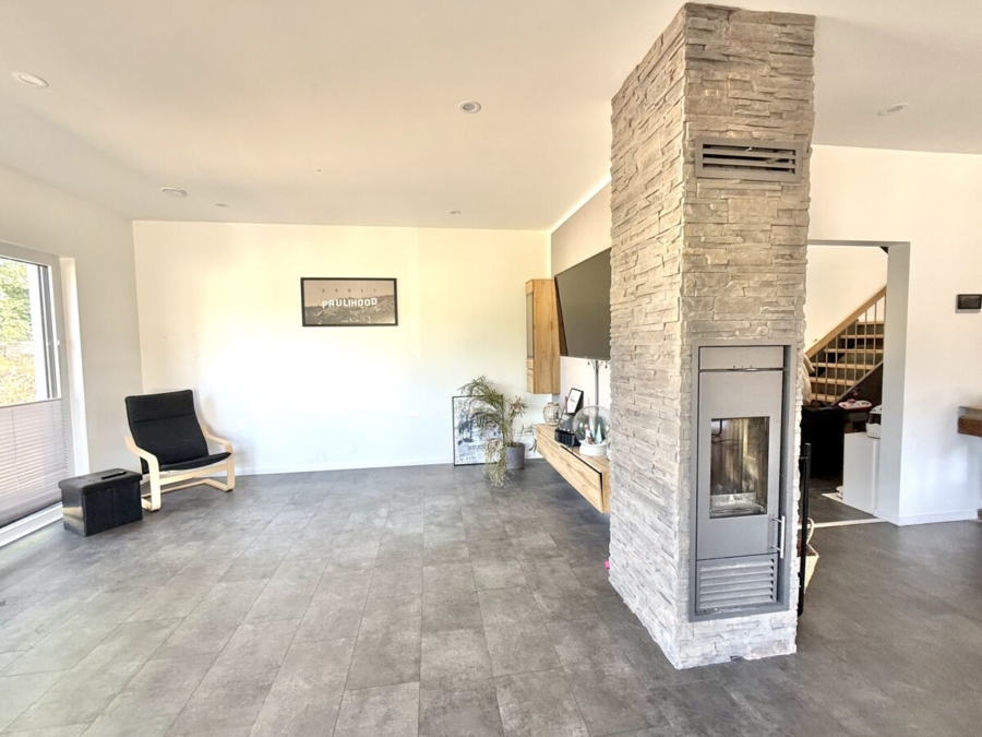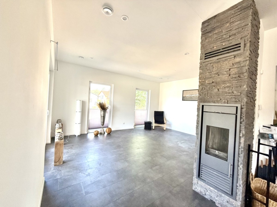 Geradeaus öffnet sich der Mittelpunkt des Hauses: der großzügige Wohn- und Essbereich. Bodentiefe Fenster durchfluten den Raum mit Licht und lassen den Blick in den Garten schweifen. Der Kingfire Stone Kaminofen bildet dabei den stimmungsvollen Mittelpunkt und sorgt für eine behagliche Wohnatmosphäre.