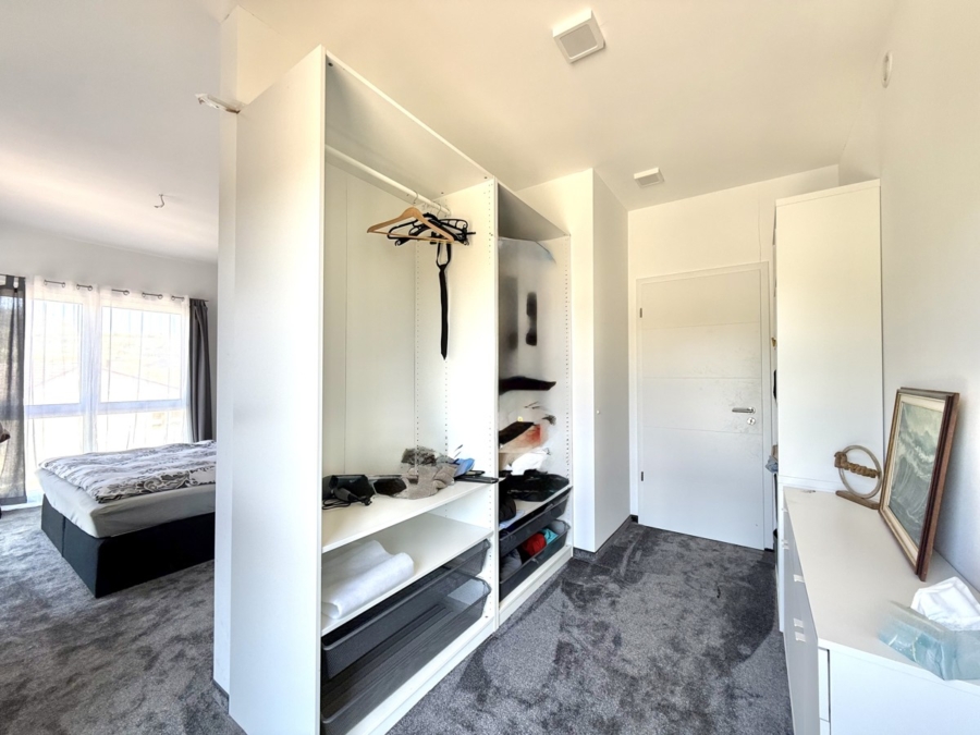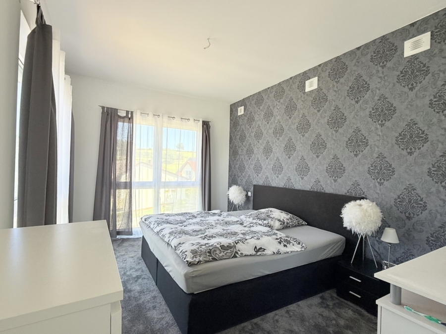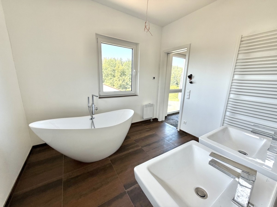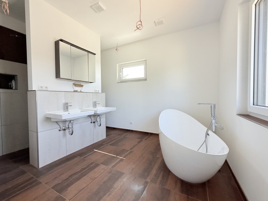 Das Highlight ist das Elternschlafzimmer: Beim Betreten führt der Weg zunächst durch eine elegante Ankleide, bevor man den Schlafbereich erreicht. Direkt angrenzend befindet sich das exklusive Badezimmer – ausgestattet mit bodengleicher Dusche und einer freistehenden ovalen Badewanne. Ein Ort, der Wellness und Entspannung ins eigene Zuhause bringt.