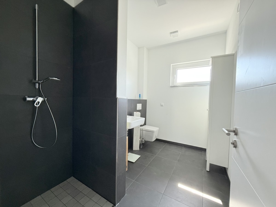 Schon beim Eintritt empfängt Sie ein heller Flur, der sich harmonisch zu dem Wohnbereich öffnet. Auf der linken Seite befindet sich ein modernes Badezimmer mit bodengleicher Dusche – ideal für Gäste oder den schnellen Alltag. Rechter Hand liegt ein großzügiges Zimmer, das sich perfekt als Homeoffice oder Gästezimmer eignet.